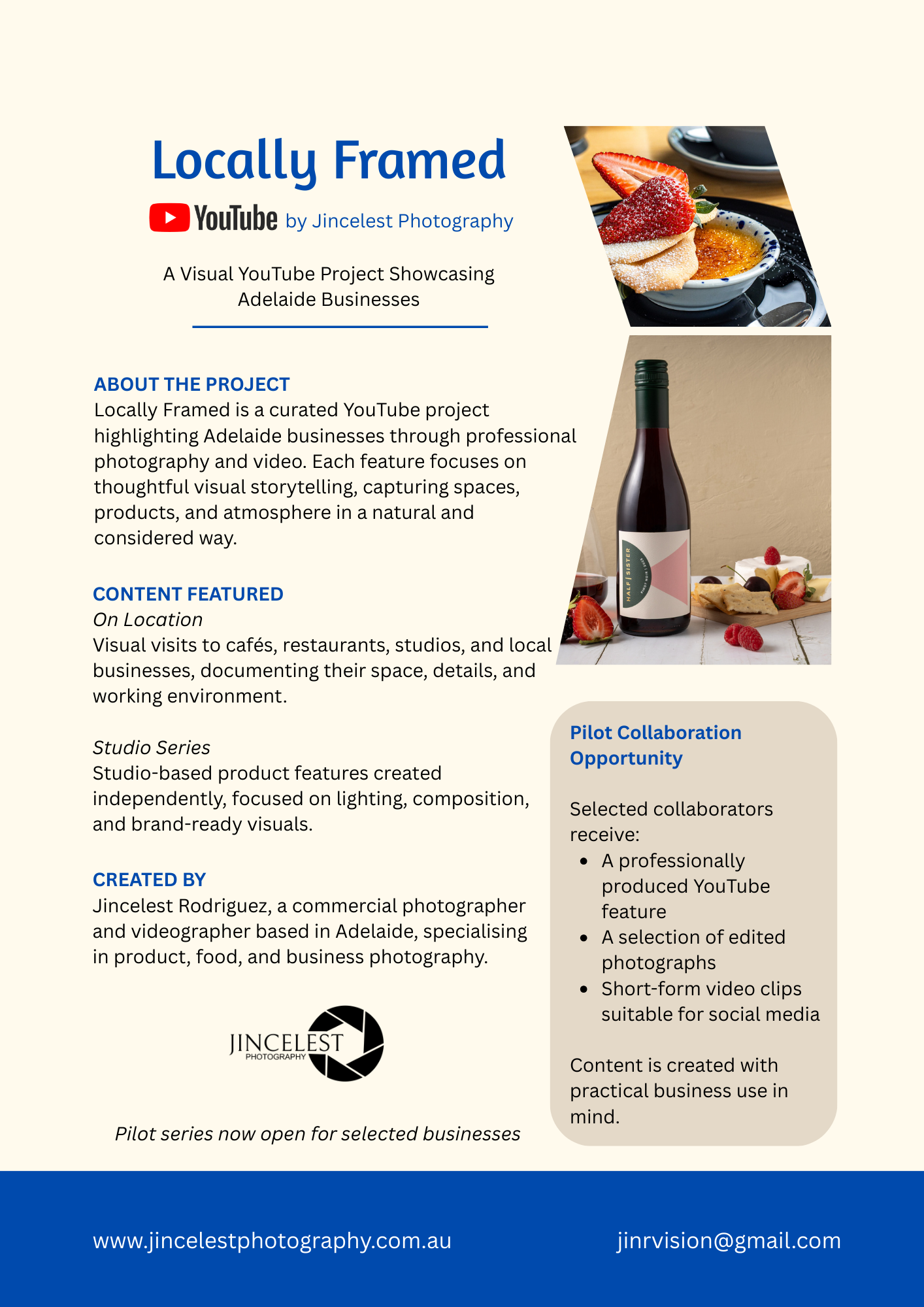 I’m currently developing a YouTube channel focused on showcasing Adelaide-based businesses, sharing their stories, and highlighting the people behind local brands.